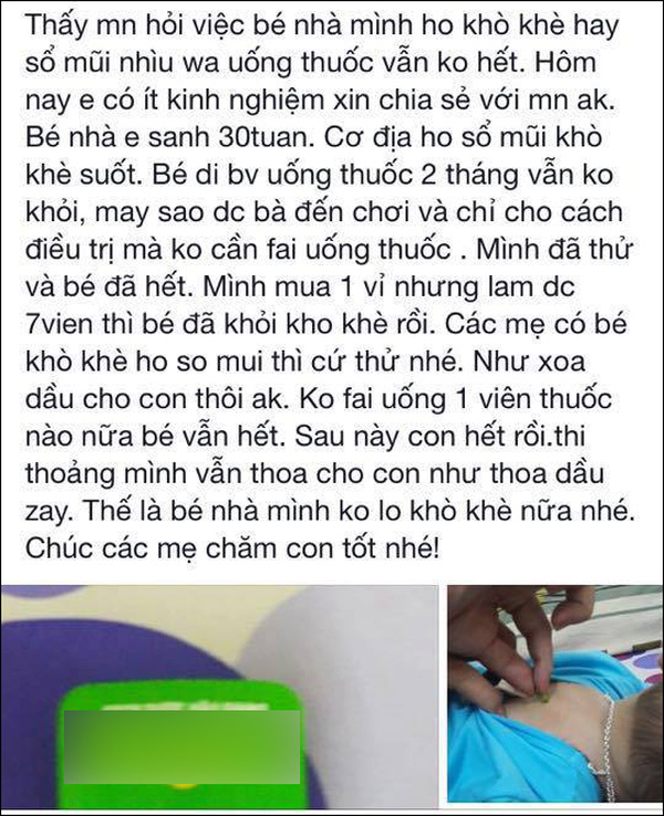Chị cho biết đã cho con uống thuốc theo đơn của bác sỹ kê hơn 2 tháng không khỏi. Sau đó, chị được họ hàng mách cho một loại thuốc viên, chỉ cần chích đầu viên thuốc ròi xoa lên ngực, lưng, bàn chân cho bé chỉ sau một đêm đã thấy con đỡ. Chị dùng đến viên thứ 7 thì cắt cơn ho cho con hoàn toàn.